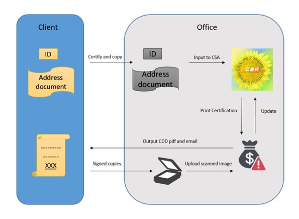 After that, scan the signed Information Forms and store them in the AML system. The CSA Entity Master File will display the existence of those documents for cross-referencing between users of both systems.