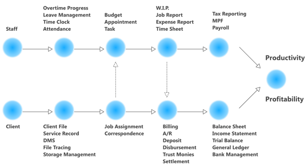 The above chart best illustrates the perfect flow of information within an organization. We have separated the two main functions: internal office management and external customer service. The top line on the chart starts with Personnel flows from the Staff level, and the second line starts with Practice flows through the Client level. The two pass on and interact and finally meet at the end of the process line to truly reflect employee’s productivity and business’s profitability.